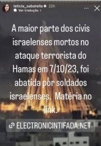 No último domingo, 05 de novembro, a atriz Letícia Sabatella fez uma publicação em uma de suas redes sociais que gerou a maior polêmica. Na situação, a mulher chegou a postar um texto que dizia que a maioria das pessoas israelenses que morrem no dia 07 de outubro foram abatidas por soldados de Israel. Vale lembrar que os ataques realizados nesta data foram feitos pelo grupo extremista Hamas e deixaram mais de mil mortos na região.