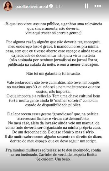 Ela também relatou o incômodo de receber, junto com as flores, orientações de como tudo deveria ser organizado dentro da própria casa, enviadas por um desconhecido. “Não foi um galanteio, foi invasão. Vale esclarecer: não teve caminhão, não teve mil buquês, no máximo uns 30, eu não sei e nem me interessa quanto custou, não importa. O que importa é a reflexão. Tem uma chave cultural bem forte: muita gente ainda lê ‘mulher solteira’ como um estado de disponibilidade pública”, desabafou.