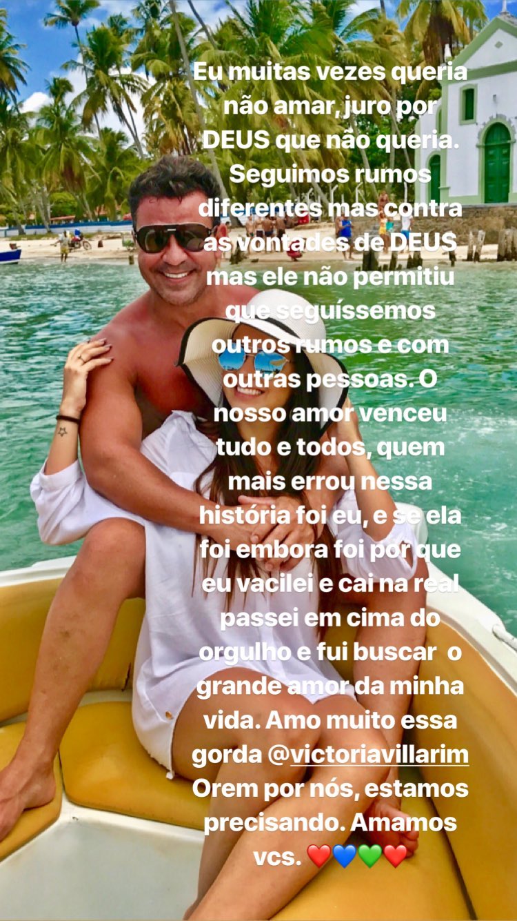 “Eu muitas vezes não queria amar, juro por DEUS que não queria. Seguimos rumos diferentes mas contra aS vontades de DEUS, mas ele não permitiu que seguíssemos outros rumos e com outras pessoas. O nosso amor venceu tudo e todos, quem mais errou nessa história foi eu, e se ela foi embora foi porque eu vacilei e caí na real. Passei por cima do orgulho e fui buscar o grande amor da minha vida. Amo muito essa gorda Victória Villarim. Orem por nós, estamos precisando. Amamos vocês.”