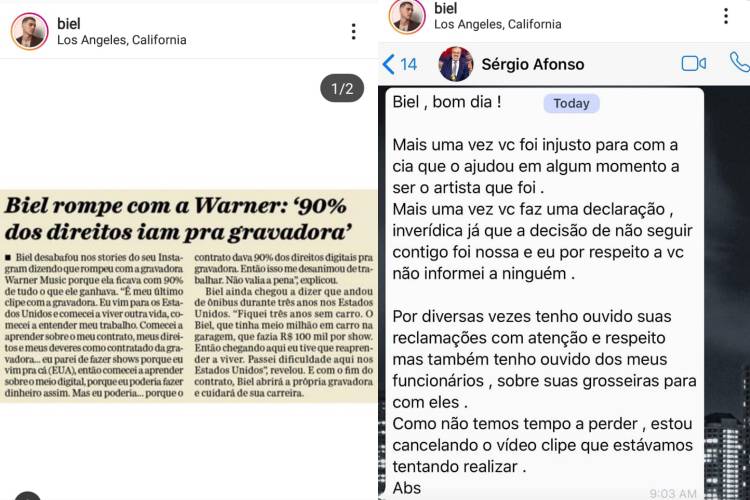 Atualmente morando nos Estados Unidos, na tarde desta quinta-feira (25), o cantor voltou ao Instagram para rebater uma mensagem que recebeu do presidente da empresa, Sérgio Afonso, ele publicou um print da conversa onde o executivo revela que o clipe dele está cancelado. Indignado, Biel rasga o verbo e detona a postura da gravadora, que segundo ele, deu as costas quando ele mais precisou. “Essa é a gravadora que me assinou já fazendo muita grana e nem tocou no assunto de advance. Essa é a gravadora que tirou o time de campo quando eu mais precisei. Esse é o presidente que me ligou quando mudei pra cá me dizendo que eu não seria capaz de competir nos EUA. A decisão de rescindir foi sua, Sérgio? 3 anos depois de saber que eu não queria mais trabalhar no seu mercado nem com seus profissionais?”, começou ele, revoltado.