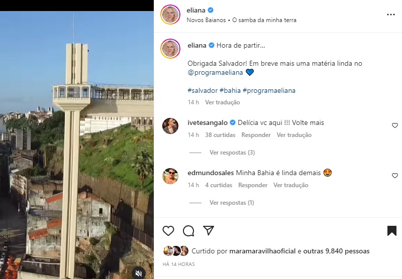 “Hora de partir… Obrigada Salvador! Em breve mais uma matéria linda no @programaeliana”, escreveu a apresentadora.