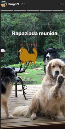 “E acordar assim? Oi, gente, bom dia! Rapaziada reunida!”, disse o empresário enquanto mostrava seus três cachorros de estimação fazendo festa para ele acordar. Ele é dono de três raças diferentes sendo elas um golden retriever, um bernesse e um border colie.
