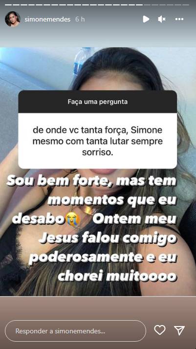 Em sua conta oficial do Instagram Stories a coleguinha resolveu abrir uma caixa de perguntas. E uma seguidora fez a seguinte pergunta: ”De onde vc tira tanta força, Simone mesmo com tanta luta sempre sorriso”. E ela repondeu: ”Sou bem forte, mas tem momentos que eu desabo. Ontem meu Jesus falou comigo poderosamente e eu chorei muito”, explicou a cantora. Em uma outra pergunta uma usuária indaga Simone sobre o casamento dela com Kaká e ela responde: ”A verdade é que nós sentimos que não dava pra viver longe um do outro”, diz.