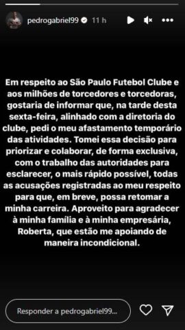 Dessa forma, por meio dos stories do Instagram, o jogador Pedrinho escreveu: “Em respeito ao São Paulo Futebol Clube e aos milhões de torcedores e torcedoras, gostaria de informar que, na tarde desta sexta-feira, alinhado com a diretoria do clube, pedi o meu afastamento temporário das atividades“, iniciou ele.