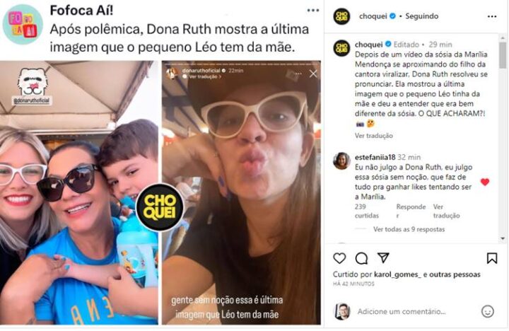Dessa forma, por meio dos stories no Instagram, Dona Ruth compartilhou a imagem de Marília Mendonça e na legenda, foi curta e grossa com os internautas que lhe criticaram: “Gente sem noção essa é última imagem que o Leo tem da mãe“, disse ela, revoltada após ser detonada na web. No entanto, mesmo após se pronunciar, a veterana voltou a receber críticas.
