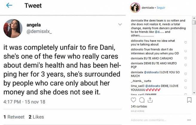 A fã usou Twitter para criticar Demi afirmando que a popstar tinha demitido injustamente sua dançarina. “É completamente injusto demitir a Dani, ela é uma das poucas que se importa de verdade com a saúde da Demi e tem ajudado ela por três anos, Demi está cercada de gente que se importa apenas com dinheiro e ela não vê isso”, disse a internauta.