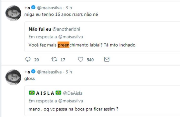 “Miga, eu tenho 16 anos… não, né?”, disse Maisa respondendo a uma seguidora. Ela ainda explicou o motivo pelo qual os seus lábios estavam carnudos: “gloss”.