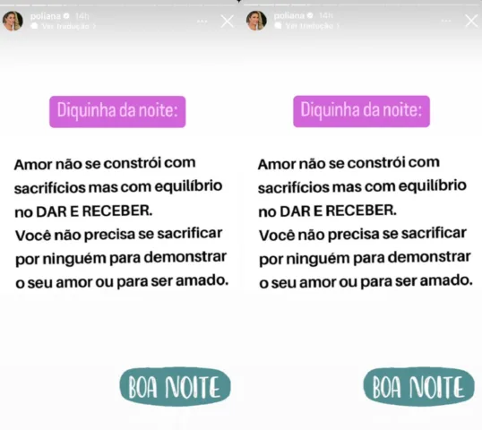 Neste domingo (11), ela usou os Stories do Instagram para publicar a famosa ”dica da noite”. Na mensagem, ela falou sobre equilíbrio de um relacionamento: ”Amor não se constrói com sacrifícios, mas com equilíbrio no DAR e RECEBER. Você não precisa se sacrificar por ninguém para demonstrar o seu amor ou para ser amado”, disse.