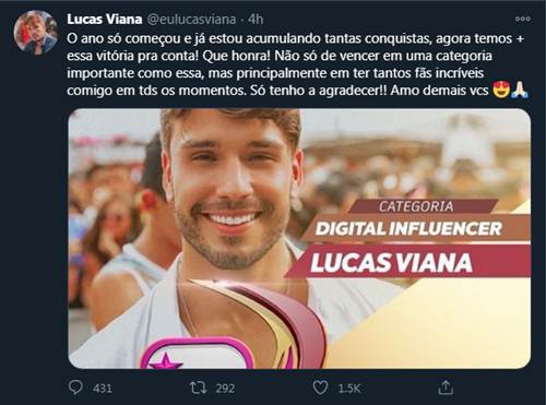 Em seu perfil no microblog, o vencedor de ‘A Fazenda 11’ agradeceu os fãs que votaram para ele ganhar mais esse prêmio na carreira. “O ano só começou e já estou acumulando tantas conquistas, agora temos mais essa vitória pra conta! Que honra! Não só de vencer em uma categoria importante como essa, mas principalmente em ter tantos fãs incríveis comigo em todos os momentos. Só tenho a agradecer!! Amo demais vocês”, escreveu no microblog.