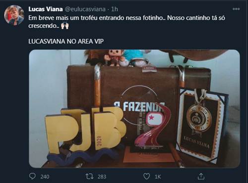 Em outro post, ele mostrou o cantinho onde coleciona troféus. “Em breve mais um troféu entrando nessa fotinha. Nosso cantinho tá só crescendo. Lucas Viana no Area Vip“, escreveu. Lucas concorreu na categoria Melhor Digital Influencer ao lado de nomes como Bianca Andrade, Rafa Kalimann, Mayra Cardi e Mileide Mihaile, que foi vencedora da primeira e segunda edição do prêmio.