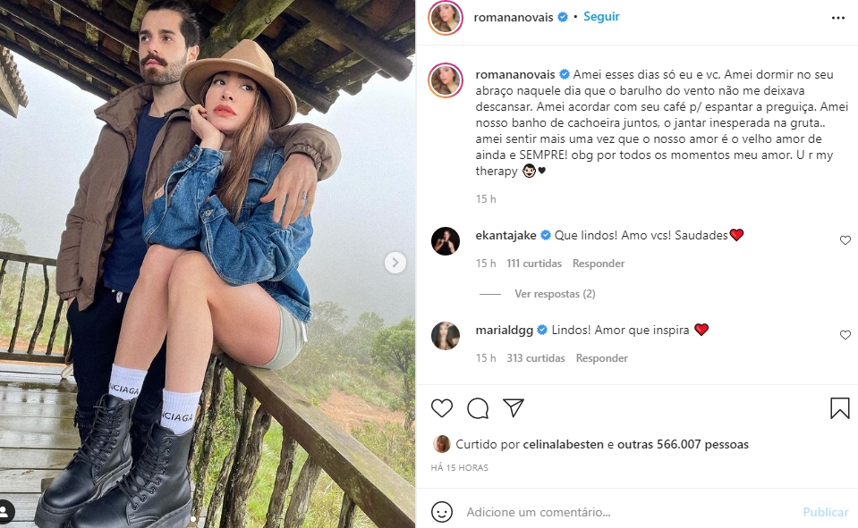 E seguiu falando sobre a alegria de poder compartilhar alguns momentos com amado: “Amei acordar com seu café para espantar a preguiça. Amei nosso banho de cachoeira juntos, o jantar inesperada na gruta..”, disse.