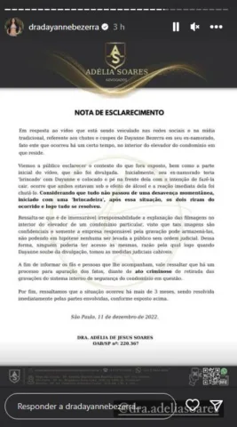 Sendo assim, a advogada resolveu se pronunciar através de sua conta oficial do Instagram. Em seus stories ela publicou o seguinte comunicado: ”Em resposta ao vídeo que está sendo veiculado nas redes sociais e na mídia tradicional, referente aos chutes e cuspes de Dayanne Bezerra em seu ex-namorado, fato este que ocorreu há um certo tempo, no interior do elevador do condomínio em que reside.”