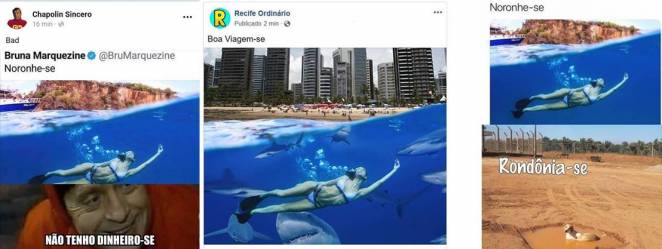 A legenda, “Noronhe-se”, causou nas redes e virou piada entre os internautas, que compartilharam fotos de enchentes em bairros de periferia ou capitais brasileiras, como “Porto-Alegre-se” e “Realengue-se”.
