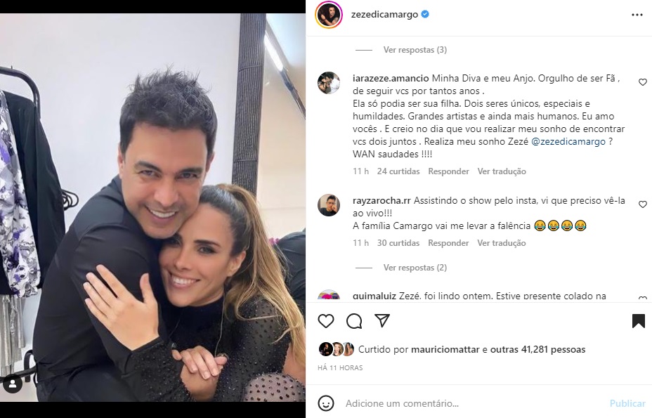 Ela só podia ser sua filha. Dois seres únicos, especiais e humildades. Grandes artistas e ainda mais humanos. Eu amo vocês . E creio no dia que vou realizar meu sonho de encontrar vcs dois juntos . Realiza meu sonho Zezé @zezedicamargo ? WAN saudades !!!!”,