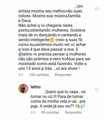 Tudo começou quando, na última quarta (8), ele postou um vídeo dentro da piscina, mostrando o corpão da namorada e foi criticado. A seguidora comentou que não esperava que o artista fosse ostentar, exibindo mulheres. Latino não se segurou e acabou xingando a internauta.