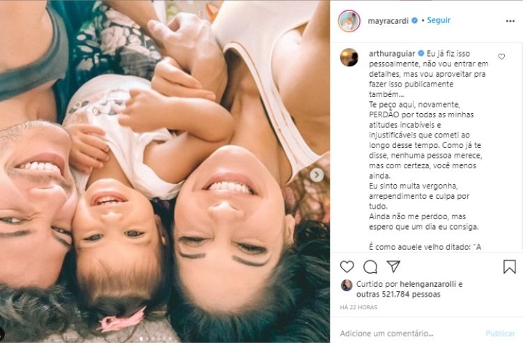 Após pedir perdão para a sua ex-mulher, com quem tem a filha Sophia, Arthur Aguiar resolveu, através de seu Instagram, mais uma vez, se desculpar com Mayra Cardi. Ele deixou um comentário no perfil oficial da esposa: