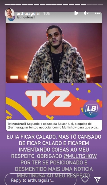 Dessa forma, após o Multishow afirmar que pretende, sim, tê-lo como um dos apresentadores do TVZ, Arthur Aguiar se manifestou e repudiou mais uma vez, as inverdades que saem sobre ele na mídia. No entanto, o cantor ainda frisou que é grato ao canal do Grupo Globo por desmentir as fakes news que circularam a respeito de sua chegada a atração musical.