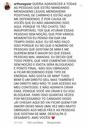 Diante desse cenário envolvendo os comentários, o ator decidiu bloquear todas as pessoas maldosas que iam no seu perfil apenas criticar. Nos comentários ele agradeceu ao carinho dos outros seguidores e deixou um comunicado.