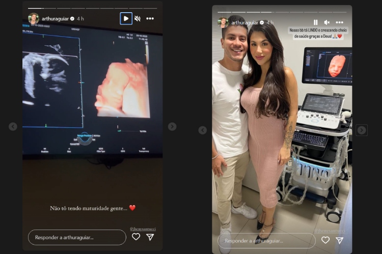 Arthur contou para o público, através do Instagram, como está a saúde de seu segundo filho (a): ‘‘Nosso bebê está lindo e crescendo cheio de saúde’’, disse ele. O ex-brother do ‘BBB22’ (TV Globo) comentou sobre maturidade ao ver o novo (a) herdeiro: ‘‘Não estou tendo maturidade, gente’’, disse ele. No final, Arthur Aguiar questionou aos seguidores através de uma enquete se eles acham que vai ser menino ou menina.