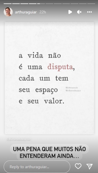 Sendo assim, por meio dos stories no Instagram, Arthur resolveu se manifestar de formar intimista e na lata rebateu o pagodeiro. “A vida não é uma disputa, cada um tem seu espaço e seu valor”, iniciou ele, que completou: “Uma pena que muitos não entenderam ainda”, disse ele.