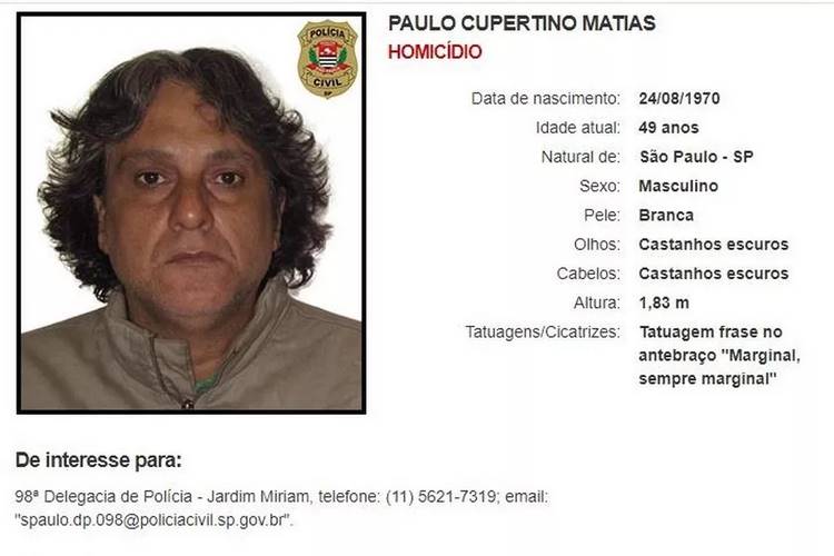 O homem de 49 anos, por sua vez, acabou por integrar na lista dos 24 criminosos mais procurados pela polícia da região paulista. Há mais de um ano desde que sumiu, a página do criminoso no site da Polícia Civil possui uma foto mais recente dele, com suas devidas descrições, onde traz detalhes da tatuagem com a frase “marginal, sempre marginal”, além dos contato para realização de denúncia caso haja captura.