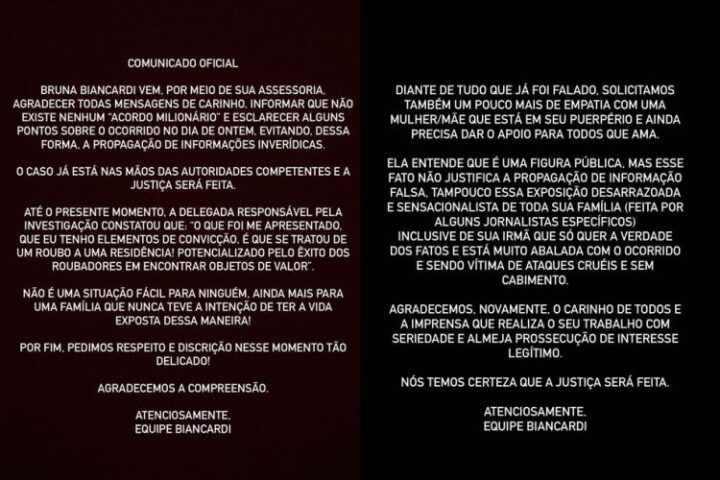 Poucas horas depois, a equipe de Bruna Biancardi retornou aos perfis da modelo, desta vez para fazer um pedido à imprensa. Os representantes da jovem recordaram que ela ainda está no período de puerpério, o que, por si só, demandaria uma grande paz para a mamãe de primeira viagem, a fim de que seja capaz de encarar os primeiros meses da maternidade de forma mais tranquila.