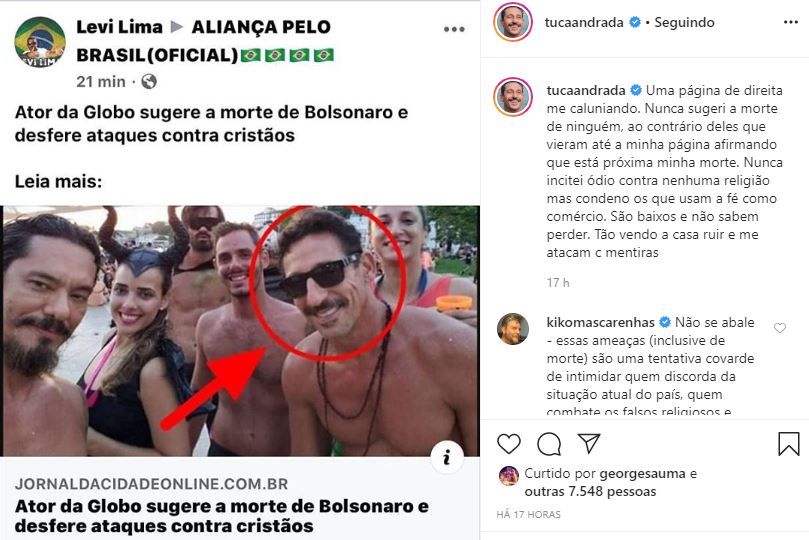 Em outro post, Tuca compartilhou a imagem de um título de uma matéria que foi postado em um grupo que apoio o presidente, onde afirma que ‘Ator da Globo sugere a morte de Bolsonaro e desfere ataques contra cristãos’, e ele aproveitou para rebater as calúnias que vem recebendo.