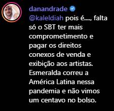 Daniel, então, lamentou a postura da emissora. “Pois é… Falta só o SBT ter mais comprometimento e pagar os direitos conexos de venda e exibição aos artistas. Esmeralda correu a América Latina nessa pandemia e não vimos um centavo no bolso”, desabafou o ator.