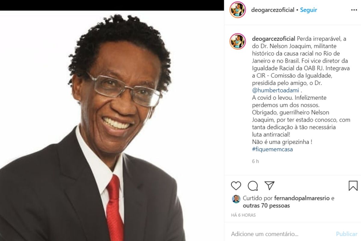 Na legenda de sua publicação, ele lamentou a morte: “Perda irreparável, a do Dr. Nelson Joaquim, militante histórico da causa racial no Rio de Janeiro e no Brasil. Foi vice diretor da Igualdade Racial da OAB RJ. Integrava a CIR – Comissão da Igualdade, presidida pelo amigo, o Dr. Humberto Adami”, iniciou o ator, que continuou a falar sobre a triste morte e aproveitou para dar uma alfinetada no presidente Jair Bolsonaro.