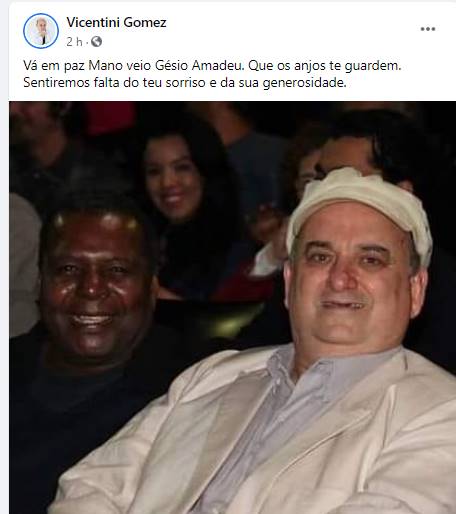 No Facebook, Gomez publicou um registro com o parceiro da vida e de trabalhos. “Vá em paz, mano véio, Gésio Amadeu. Que os anjos te guardem. Sentiremos falta do teu sorriso e da sua generosidade”, escreveu ele na legenda.