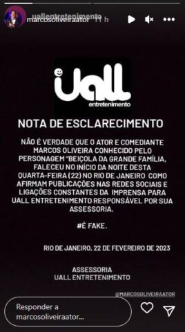 “Não é verdade que o ator e comediante Marcos Oliveira, conhecido pelo personagem ‘Beiçola’ da Grande Família, faleceu no início da noite desta quarta-feira (22) no Rio de Janeiro. Publicações maldosas espalharam fake news em redes sociais, que fizeram com que a imprensa entrasse em contato com a Uall Entretenimento, que administra sua carreira. Alguns portais noticiaram informação falsa“, diz o comunicado.