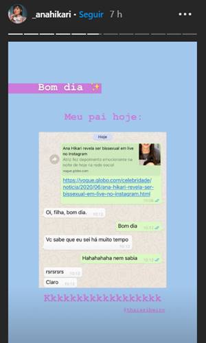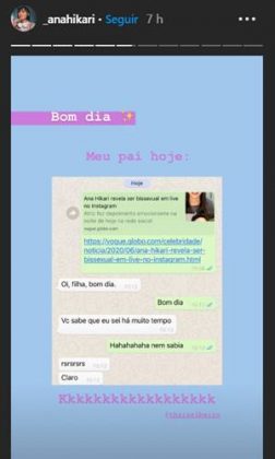Na tarde desta terça-feira (30), a atriz também postou um stories de uma conversa com seu pai, onde tinha enviado o link da matéria que dizia que ela era bissexual e ele respondeu: “você sabe que eu sei a muito tempo”, comentou o pai de Ana.