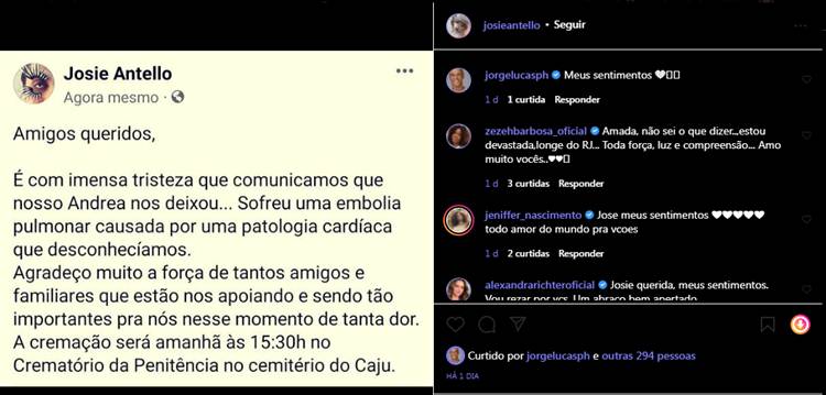 Em seu perfil oficial no Instagram, Josie deu a notícia. “Amigos queridos, é com imensa tristeza que comunicamos que nosso Andrea nos deixou… Sofreu uma embolia pulmonar causada por uma patologia cardíaca que desconhecíamos”, escreveu.