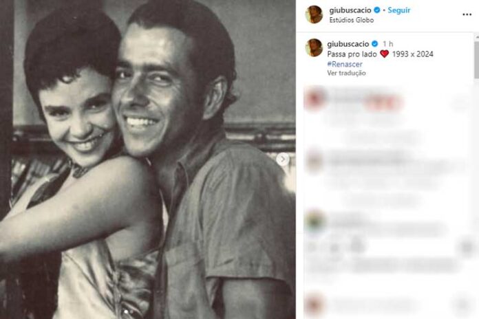 Giullia Buscacio, intérprete da personagem Sandra no remake de “Renascer”, compartilhou com seus seguidores no Instagram nesta quinta-feira (23) uma foto inédita mostrando os personagens de Marcos Palmeira e Luciana Braga na primeira versão da novela.