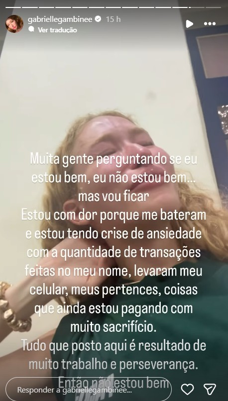 Gabrielle Gambine expõe violência e desabafa: “Eu não estou bem”