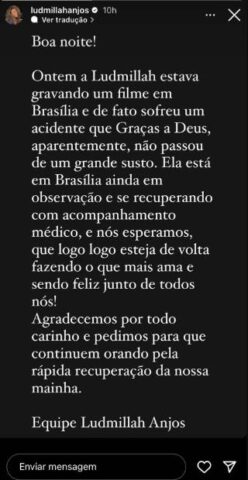 Sendo assim, como citado acima, a equipe de Ludmillah clamou por orações para a atriz: “Ontem, a Ludmillah estava gravando um filme em Brasília e, de fato, sofreu um acidente que, graças a Deus, aparentemente, não passou de um grande susto. Ela está em Brasília ainda em observação e se recuperando com acompanhamento médico, e nós esperamos que logo logo esteja de volta fazendo o que mais ama e sendo feliz junto de todos nós!“, diz o comunicado.