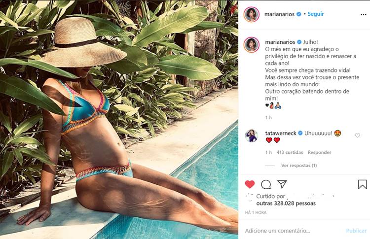 Na foto postada, a atriz aparece sentada à beira da piscina, usando um biquíni bem colorido, e com a barriga já dando seus primeiros sinais. Na legenda ela escreveu: “Julho! O mês em que eu agradeço o privilégio de ter nascido e renascer a cada ano! Você sempre chega trazendo vida! Mas dessa vez você trouxe o presente mais lindo do mundo: Outro coração batendo dentro de mim!”, comentou a atriz.