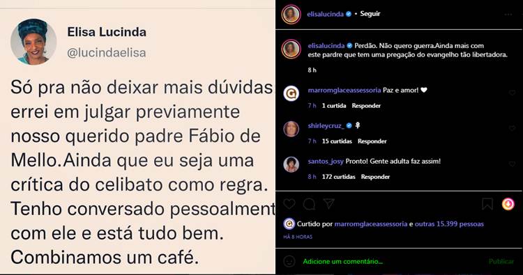 Elisa a compartilhou uma imagem em que assume que errou ao julgar o religioso previamente. Ela falou ainda que já conversou com o clérigo e que as coisas estão bem entre eles. “Só para não deixar mais dúvidas: errei em julgar previamente nosso querido padre Fábio de Melo. Ainda que seja uma crítica do celibato como regra. Tenho conversado pessoalmente com ele e está tudo bem. Combinamos um café”, disse ela.