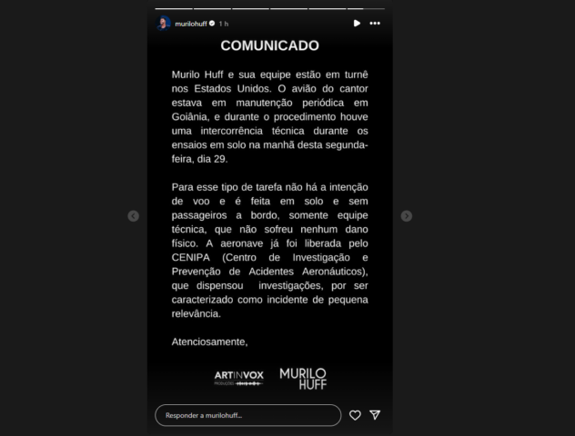 A nota enviada pela equipe se inicia explicando que Huff e sua equipe estavam em turnê pelos Estados Unidos. “Murilo Huff e sua equipe estão em turnê nos Estados Unidos. O avião do cantor estava sendo levado para a área reservada no aeroporto de Goiânia para realizar ensaios no solo, quando houve uma intercorrência técnica, na manhã desta segunda-feira, dia 29”, diz o texto.