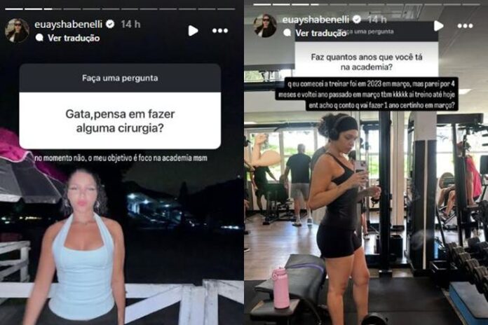 Através dos stories no Instagram, Aysha Benelli foi bastante direta ao responder uma dúvida de uma de suas seguidoras. “Gata, pensa em fazer alguma cirurgia?“, quis saber a fã. “No momento, não [penso em fazer], o meu objetivo é foco na academia, mesmo“, respondeu a atriz.