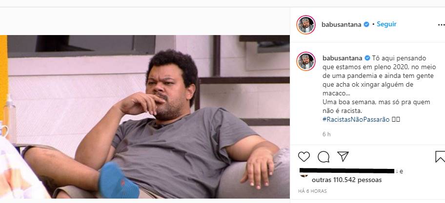 “Tô aqui pensando que estamos em pleno 2020, no meio de uma pandemia e ainda tem gente que acha ok xingar alguém de macaco… Uma boa semana, mas só pra quem não é racista. #RacistasNãoPassarão”, escreveu ele.