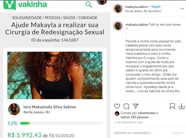 Em dezembro, a dançarina fez um post da vakinha em seu perfil no Instagram, depois de ter uma conta hackeada. Na ocasião, ela já havia arrecadado R$ 5.992,43, 125 do valor total que estima para fazer o procedimento.