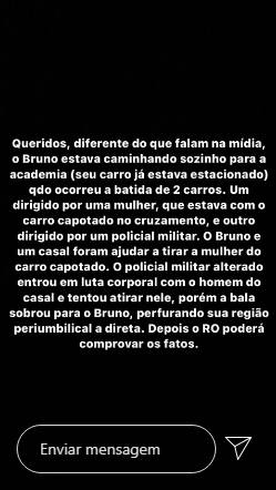 No stories, a equipe ainda informa como Bruno foi baleado. “O Bruno estava caminhando sozinho para a academia (seu carro já estava estacionado) quando ocorreu a batida de 2 carros. Um dirigido por uma mulher, que estava com o carro capotado no cruzamento, e outro dirigido por um policial militar. O bruno e um casal foram ajudar a tirar a mulher do carro capotado. O policial militar alterado entrou em luta corporal com o homem do casal e tentou atirar nele, porém a bala sobrou para o Bruno, perfurando a região peri umbilical. Depois o RO poderá comprovar os fatos”.