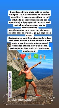 Em seu perfil no Instagram, a assessoria do artista informou que Bruno ‘teve o rim direito e o intestino atingidos”.A equipe ainda informa que ele talvez tenha que ficar no “CTI intubado e sedado (respirando por aparelhos) até porque a pressão arterial está muito baixinha(está em usos de noradrenalina)”.