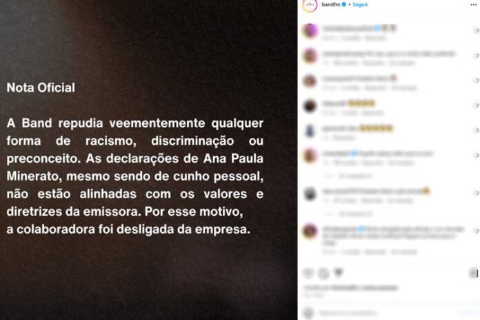 “A Band repudia veementemente qualquer forma de racismo, discriminação ou preconceito. As declarações de Ana Paula Minerato, mesmo sendo de cunho pessoal, não estão alinhadas com os valores e diretrizes da emissora. Por esse motivo, a colaboradora foi desligada da empresa”, explicou em comunicado.