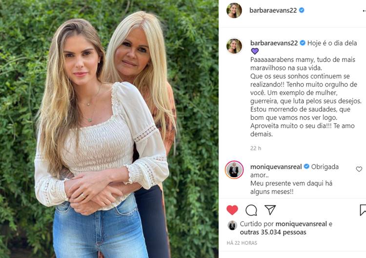 Ontem, Bárbara usou seu Instagram para parabenizar a mãe Monique Evans: “Hoje é o dia dela Paaaaaarabens mamy, tudo de mais maravilhoso na sua vida. Que os seus sonhos continuem se realizando!! Tenho muito orgulho de você. Um exemplo de mulher, guerreira, que luta pelos seus desejos. Estou morrendo de saudades, que bom que vamos nos ver logo. Aproveita muito o seu dia!!! Te amo demais”, escreveu a modelo publicando uma foto ao lado da mãe.