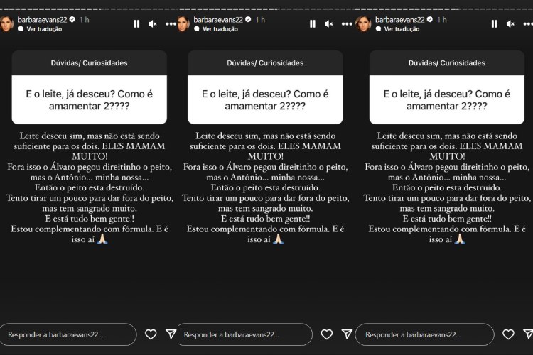 A influenciadora continuou e apontou a diferenciação dos meninos em relação a amamentação: “Fora isso, o Álvaro pegou direitinho o peito, mas o Antônio… minha nossa! Então, o peito está destruído. Tento tirar um pouco para dar fora do peito, mas tem sangrado muito”, explicou Bárbara, ressaltando que isso faz parte do momento. Adiante, ela despreocupou as pessoas: “E está tudo bem gente! Estou complementando com fórmula. E é isso aí”.