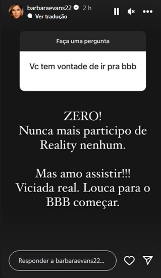 Outro fã de Bárbara, que já participou de ‘A Fazenda 6’, ainda quis saber se ela entraria no ‘Big Brother Brasil’. “Você tem vontade ir para o ‘BBB’? Apesar de negar querer participar do reality, Bárbara fez uma confissão. “Zero! Nunca participo de reality nenhum. Mas amo assistir. Viciada real. Louca para o BBB começar”, entregou.