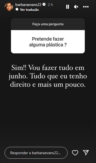 Na tarde desta quinta-feira (04), ela revelou alguns planos e também rejeitou outras possibilidades. Um fã quis saber se Bárbara, que acabou de ter parto de gêmeos, vai fazer plástica. A influencer não se esquivou de responder. “Vou fazer tudo em junho. Tudo o que tenho direito e mais um pouco”, afirmou.