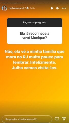 Através de sua conta oficial do Instagram Stories a famosa deu detalhes a respeito da situação e deixou seus seguidores surpresos. A ex-peoa abriu uma caixinha de perguntas e um fã indagou: ”Ela [Ayla] já reconhece a vovó Monique?’‘. Logo em seguida, Bárbara comunica que a pequena não se encontra de forma frequente com a avó materna. Ela responde: ”Não, ela vê a minha família que mora no RJ muito pouco para lembrar. Infelizmente. Julho vamos visitá-los”.